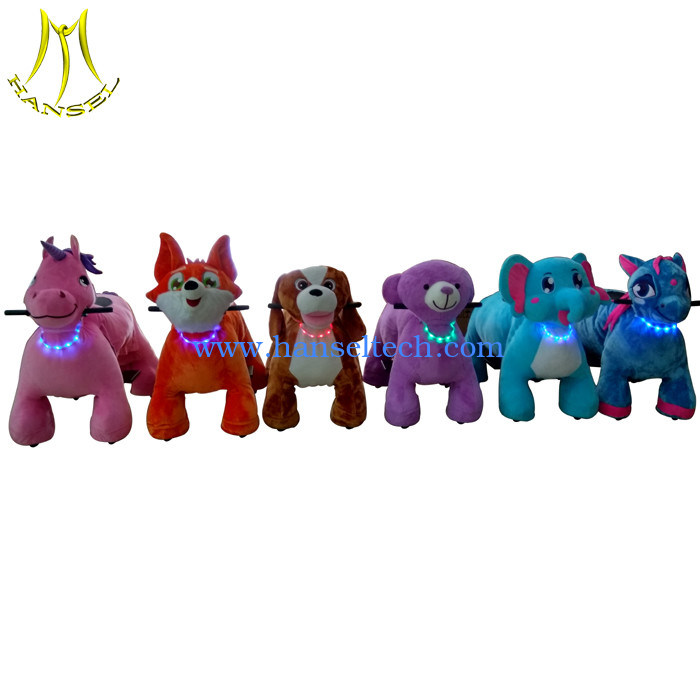 Hansel plush animal scooter are battery operated with coin or non coin type animals,it can walking in outdoor and indoor playground,we use fireproof plush with cotton inside for the animal skin,and structure material inside is mental steel frame which is very strong to bear a weight of 130kg.with its attractive appearance to consumers and fast profits to operator,more and more people are join this business,Will you join this business?