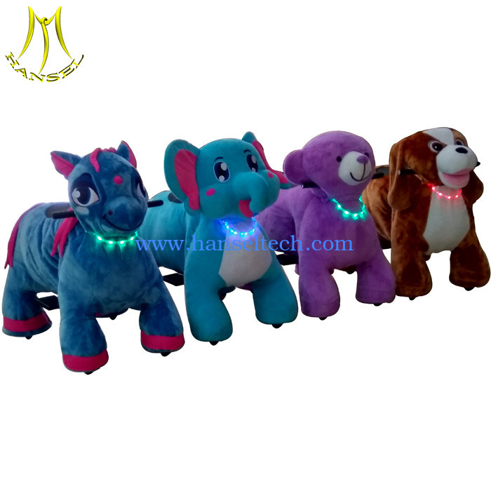 Hansel plush animal scooter are battery operated with coin or non coin type animals,it can walking in outdoor and indoor playground,we use fireproof plush with cotton inside for the animal skin,and structure material inside is mental steel frame which is very strong to bear a weight of 130kg.with its attractive appearance to consumers and fast profits to operator,more and more people are join this business,Will you join this business?