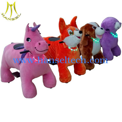 Hansel plush animal scooter are battery operated with coin or non coin type animals,it can walking in outdoor and indoor playground,we use fireproof plush with cotton inside for the animal skin,and structure material inside is mental steel frame which is very strong to bear a weight of 130kg.with its attractive appearance to consumers and fast profits to operator,more and more people are join this business,Will you join this business?